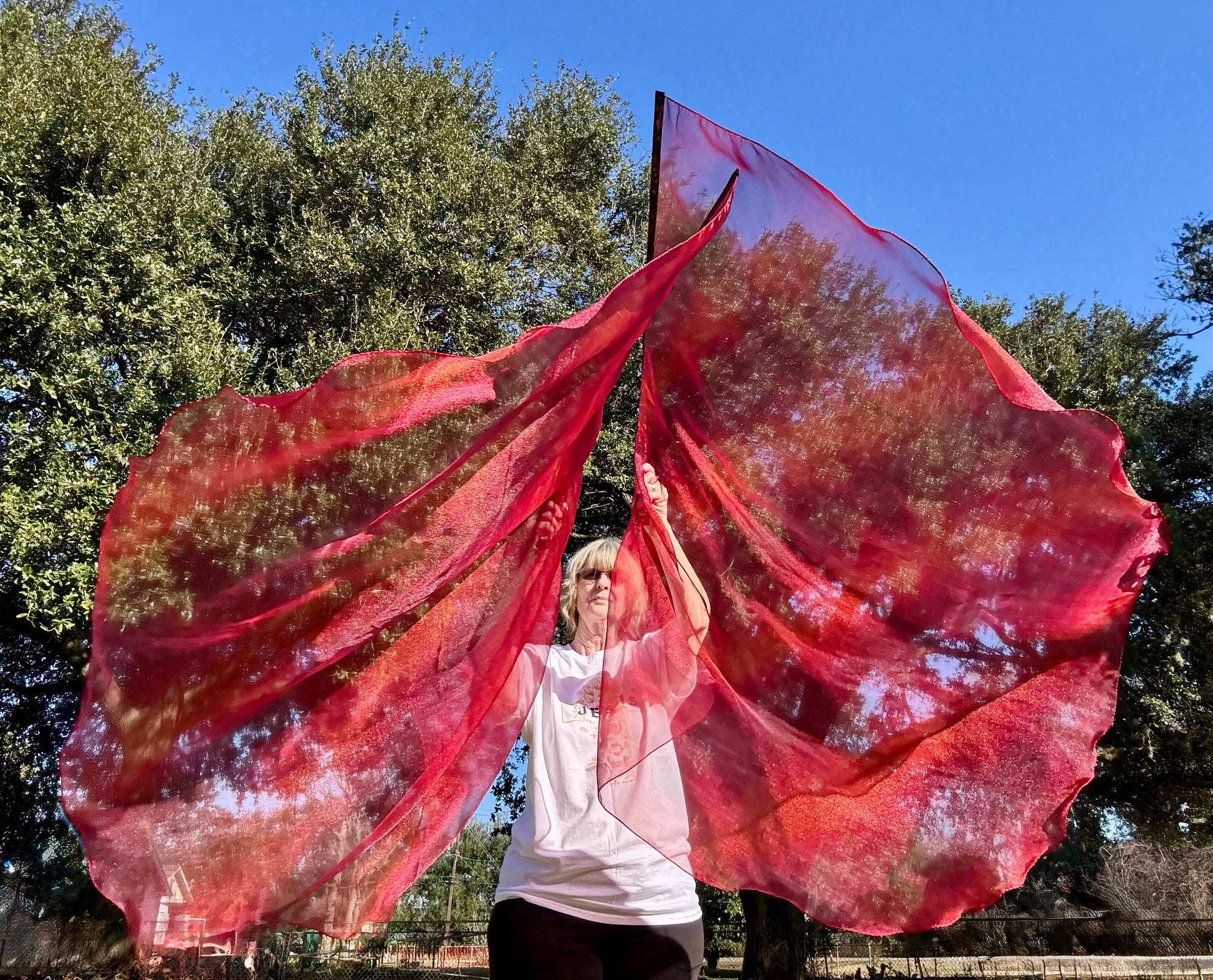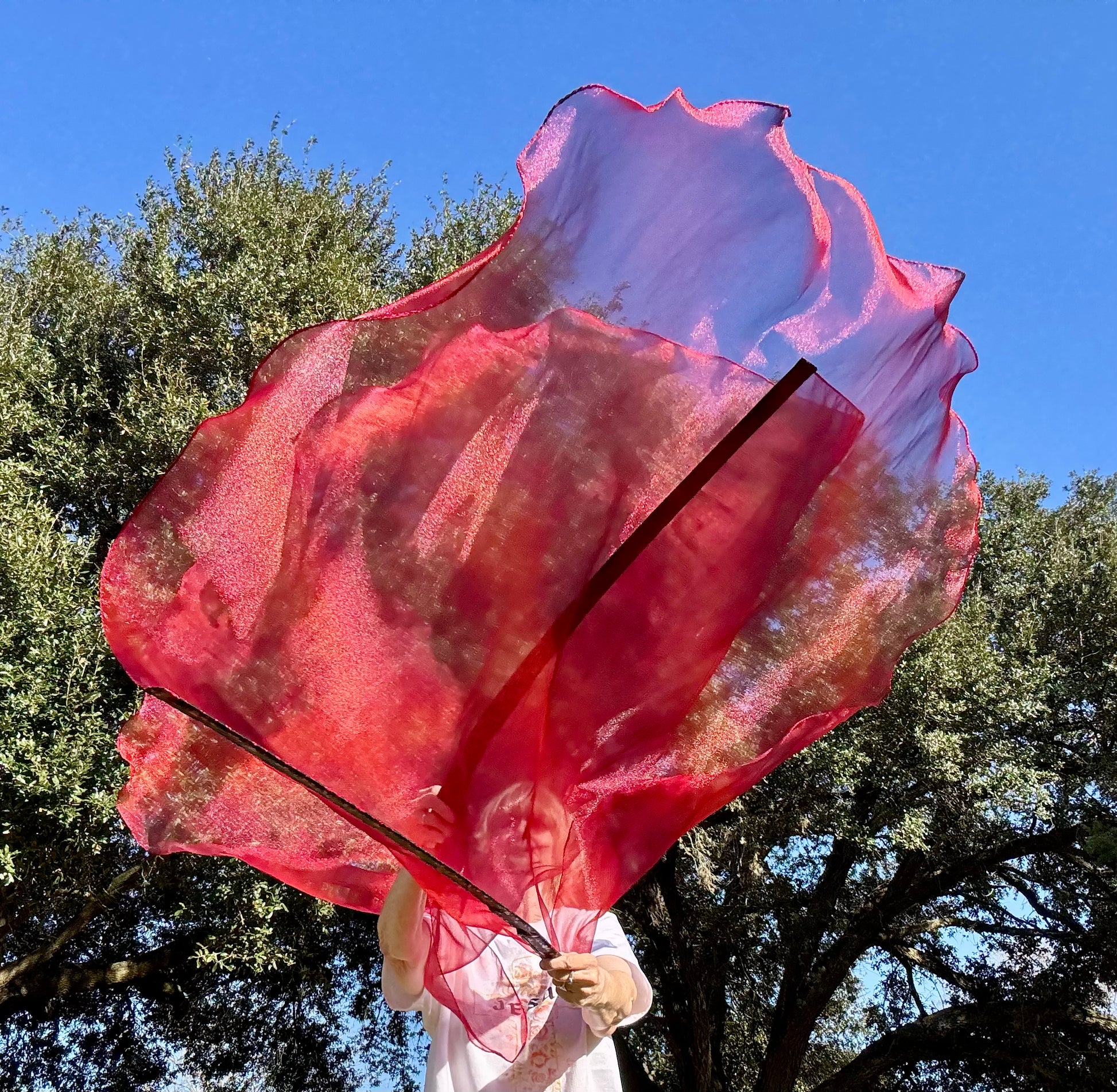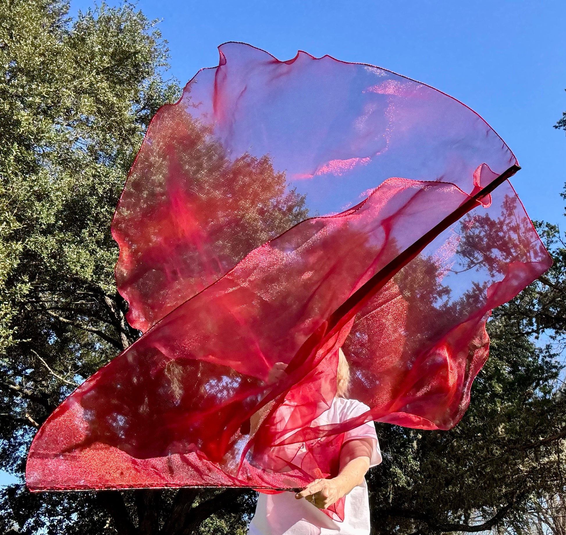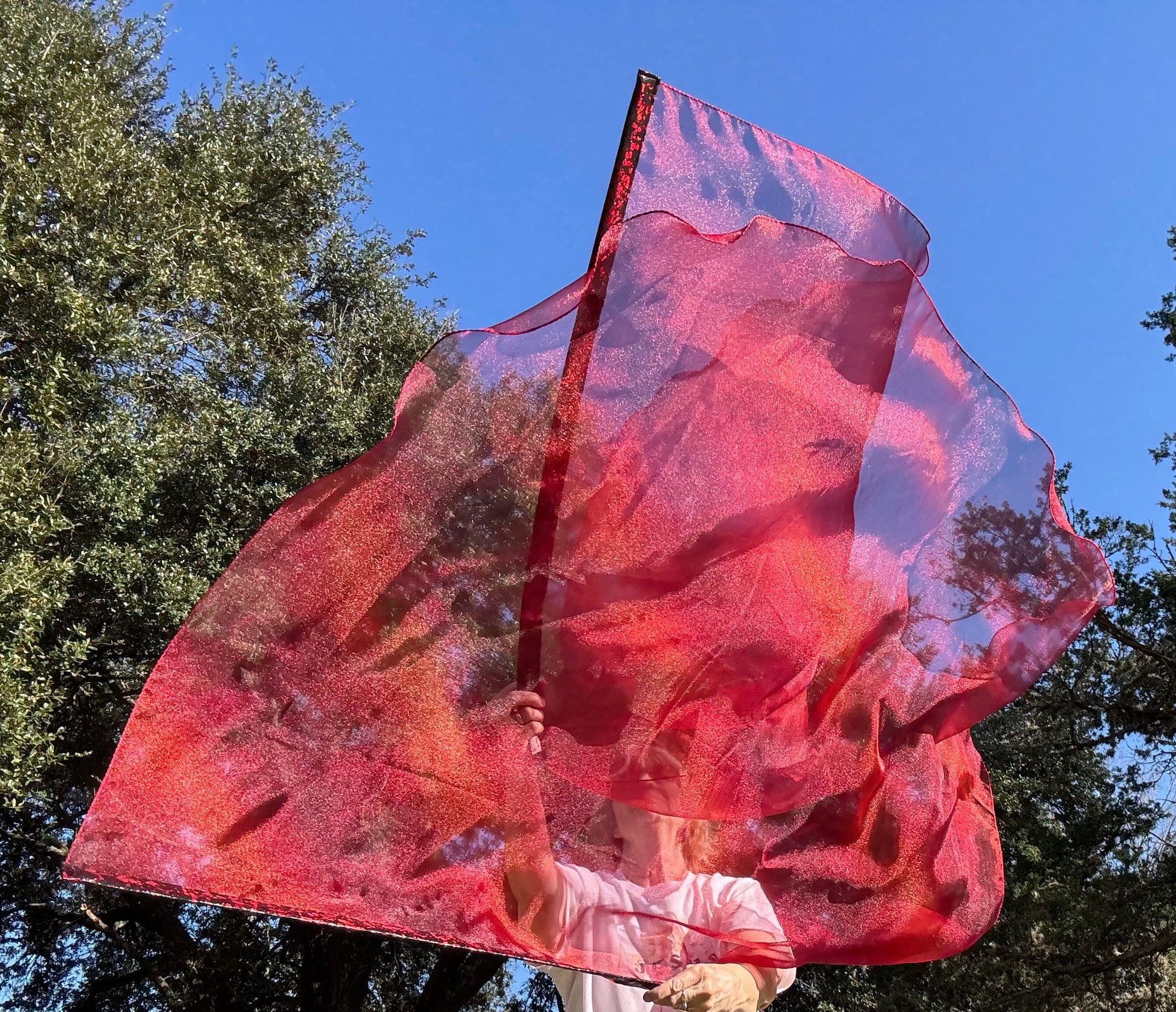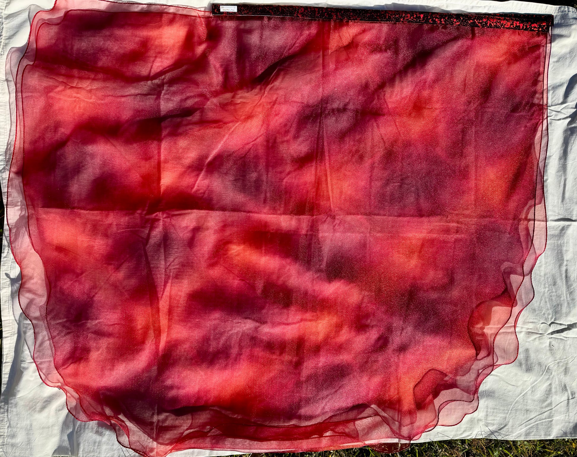 Crystal Organza fabric is bright red with dark red patches